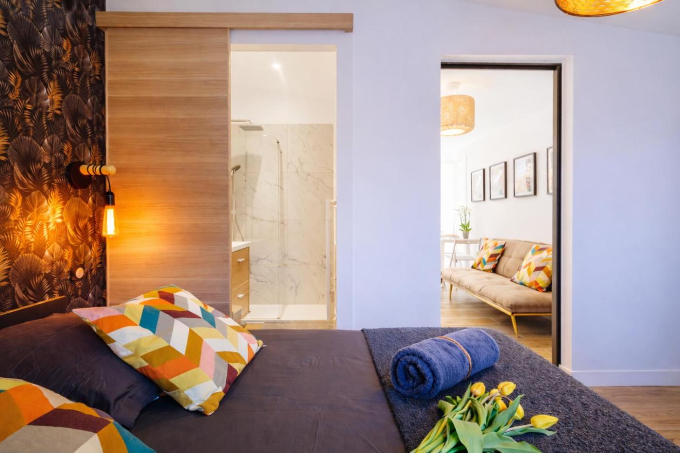 Appartement 1 Chambre. The fully equipped kitchen features a stovetop, a dishwasher, kitchenware and an oven. This apartment is air-conditioned and has a seating area with a flat-screen TV, a washing machine, a coffee machine, a dining area, as well as a wardrobe. The unit has 1 bed.