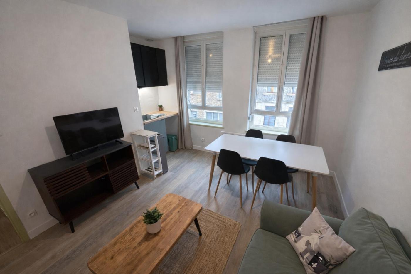 Appartement 1 Chambre. The apartment features 1 bedroom and 1 bathroom with a shower and free toiletries. The well-fitted kitchen has a stovetop, a refrigerator, kitchenware and a microwave. The apartment provides a flat-screen TV with streaming services, a coffee machine, a seating area, a dining area as well as a quiet street view. The unit offers 1 bed.