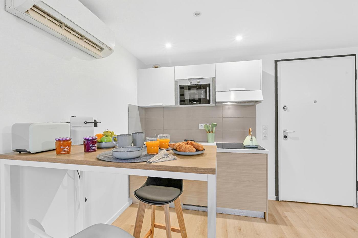 Cet appartement avec climatisation se compose de 1 chambre, dun salon, dune cuisine entièrement équipée avec un réfrigérateur et une machine à café, ainsi que de 1 salle de bains avec une douche. Des serviettes et du linge de lit sont à disposition.