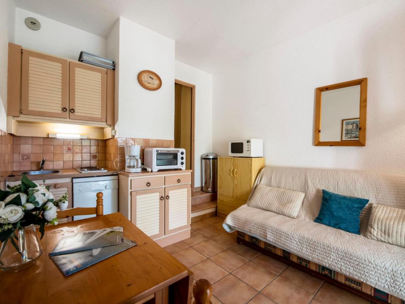 Appartement. 3-room apartment 35 m2, on the ground floor, west facing position: livingdining room with TV, video, DVD and air-conditioning. Exit to the terrace. 1 room with 1 double bed (140 cm, length 190 cm). Exit to the terrace. 1 room with 1 x 2 bunk beds. Open kitchen (2 hotplates, oven, dishwasher, micro wave). Shower, sep. WC. Electric heating. Terrace 10 m2, covered, patio 20 m2. Terrace furniture, deck chairs (2). Reserved parking space n 39. Maximum 1 small pet dog allowed.