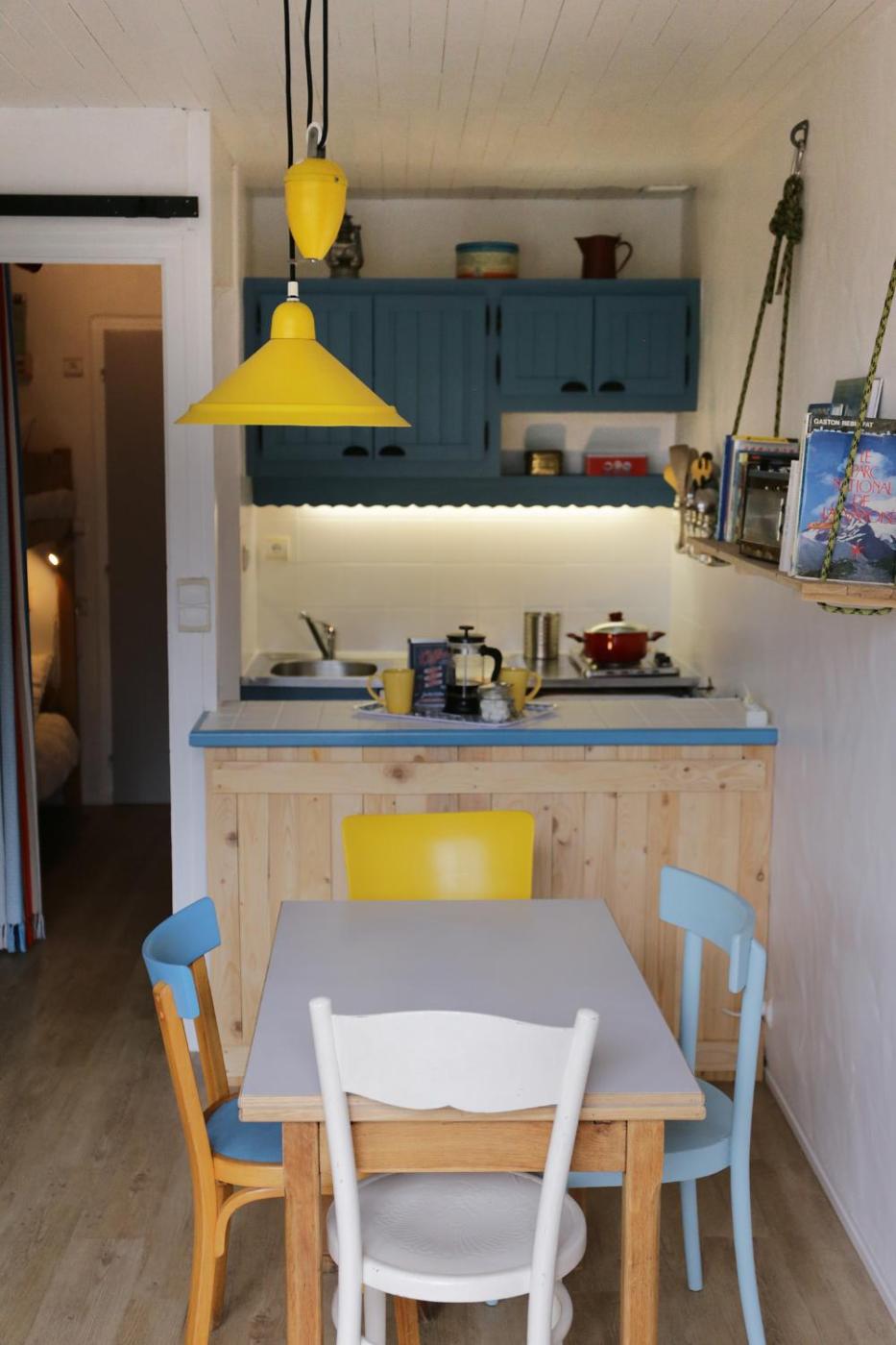 Studio - Vue sur Montagne. This ground-floor studio features a living area, a kitchenette, a corner sleeping area with bunk beds, a 16 m² terrace and ski storage. The bathroom has a bath. ;