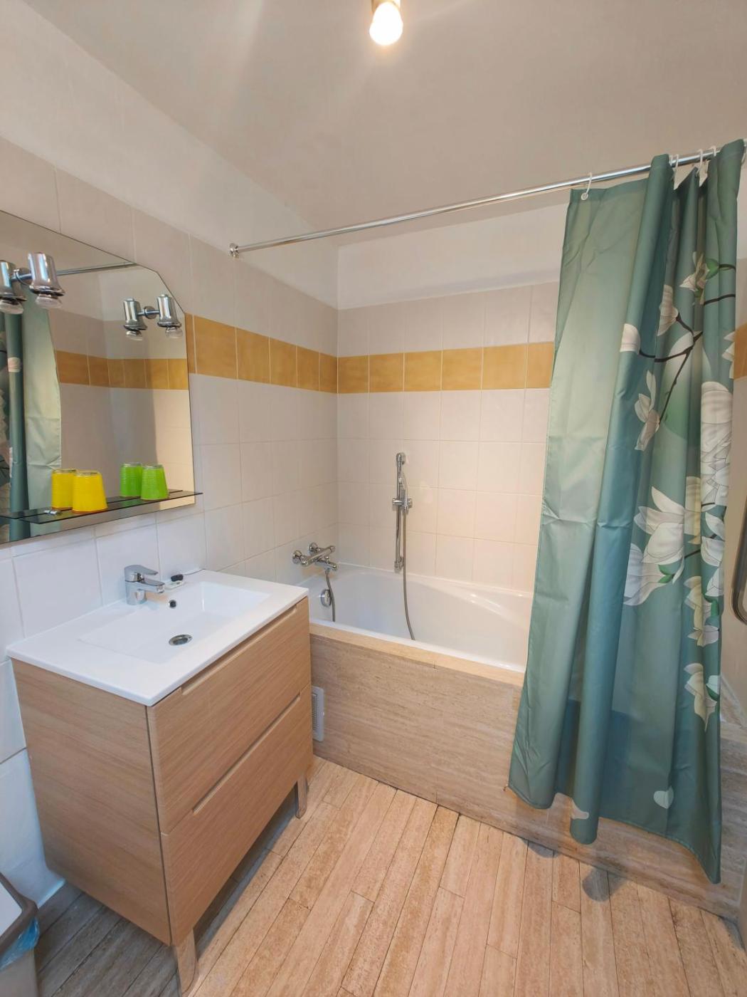 Chambre Double avec Salle de Bains (Baignoire et Douche) - Pastel. Accessible par une entrée privée, cet hébergement situé au rez-de-chaussée dispose dun lit king-size, dune télévision à écran plat et dun plateaubouilloire. La salle de bains privative est pourvue dune baignoire, dune grande douche, dun sèche-serviettes, dun sèche-cheveux et de serviettes. ;