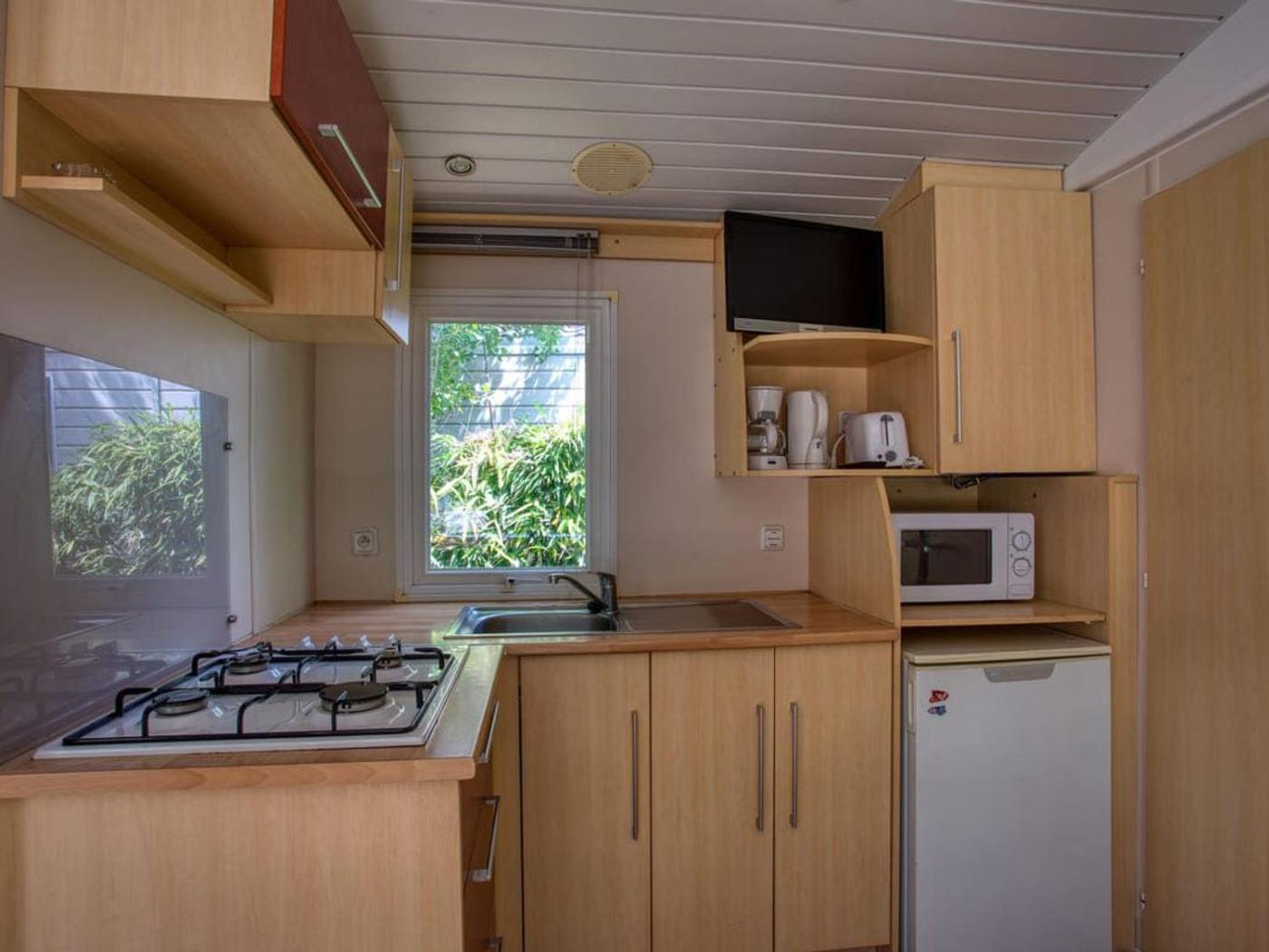 Mobile Home. Featuring a private entrance, this mobile home consists of 2 bedrooms, 1 bathroom and a kitchen. The well-equipped kitchen features a refrigerator, kitchenware, a microwave and a toaster. Boasting a terrace, this mobile home also provides a coffee machine, a dining area and a TV.