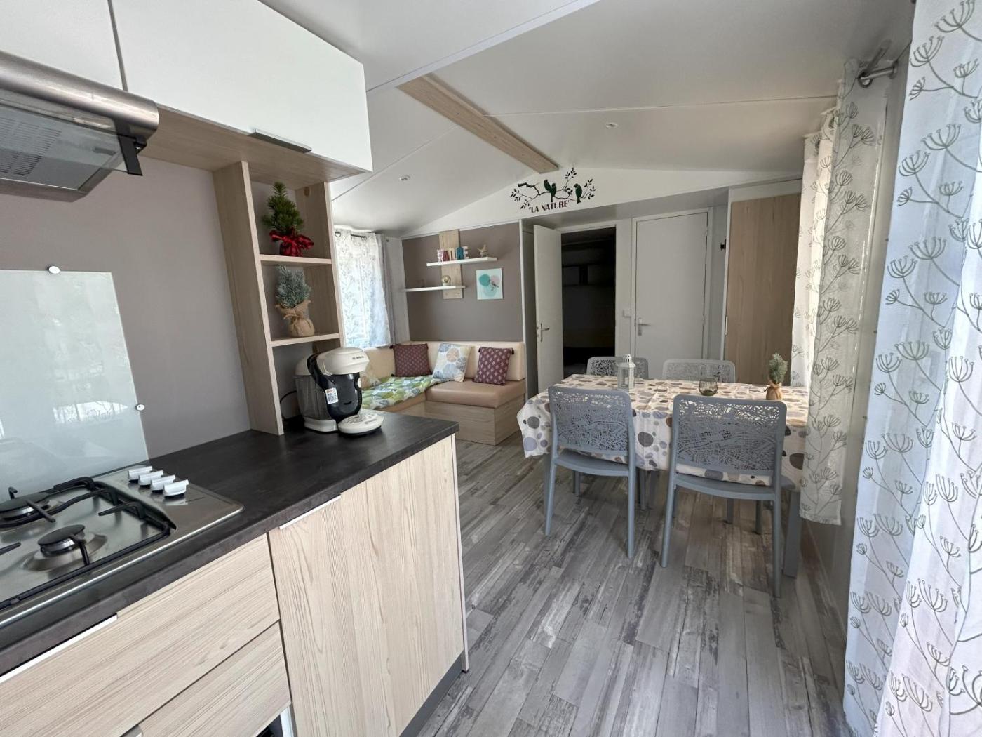 Mobile Home. This mobile home features 1 living room, 2 separate bedrooms and 1 bathroom with a shower and free toiletries. Guests will find a stovetop, a refrigerator, a dishwasher and kitchenware in the kitchen. The mobile home also comes with a barbecue. Boasting a terrace with garden views, this mobile home also features air conditioning and a flat-screen TV. The unit has 3 beds. ;