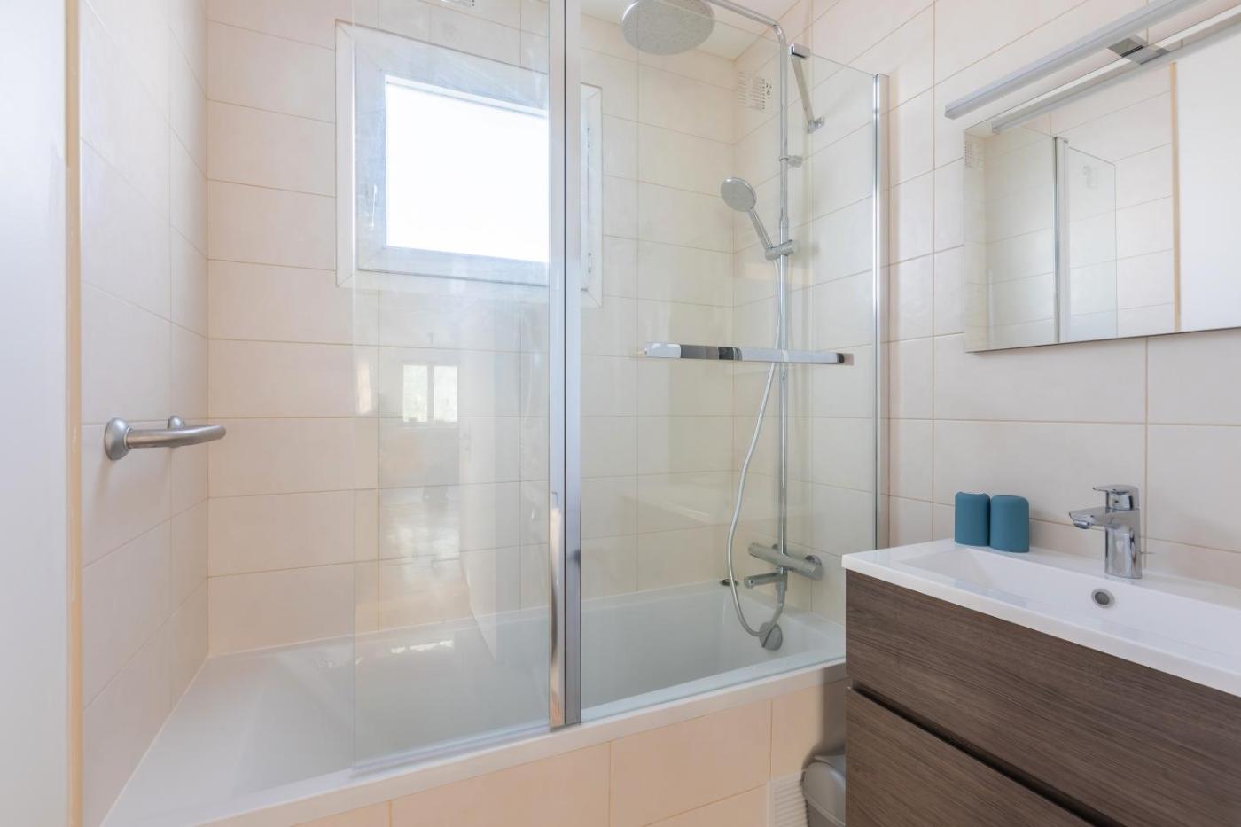 Appartement 3 Chambres. Cet appartement spacieux comprend un salon, 3 chambres séparées ainsi que 2 salles de bains avec baignoire et douche. Vous pourrez préparer vos repas dans la cuisine équipée de plaques de cuisson, d’un lave-vaisselle et d’un réfrigérateur. Des ustensiles de cuisine sont fournis. Cet appartement dispose d’un balcon, d’un lave-linge, d’un plateaubouilloire et d’une télévision. Ce logement comporte 4 lits.