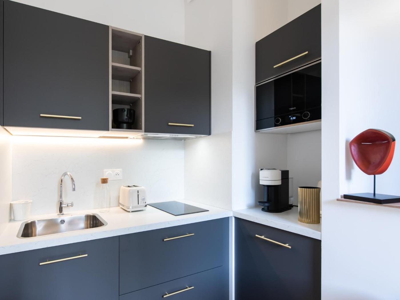 Appartement 1 Chambre. Bénéficiant d’une entrée privée, cet appartement se compose d’un salon, d’une chambre séparée, ainsi que d’une salle de bains avec douche et sèche-cheveux. La cuisine entièrement équipée est pourvue de plaques de cuisson, d’un réfrigérateur, d’un four et d’ustensiles. Cet appartement insonorisé dispose également d’une télévision à écran plat et d’une terrasse offrant une vue sur la cour intérieure. Le logement compte 1 lit.