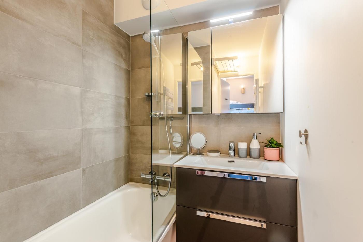 Cet appartement se compose de 1 chambre, dun salon, dune cuisine entièrement équipée avec un réfrigérateur et une bouilloire, ainsi que de 1 salle de bains avec une baignoire et un sèche-cheveux. Une télévision est à disposition.