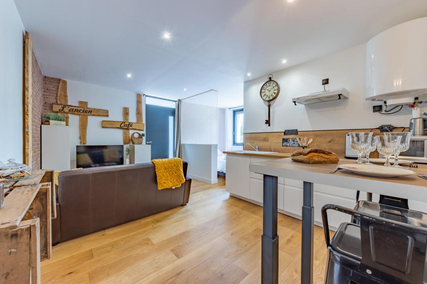 Appartement 1 Chambre. Boasting a private entrance, this air-conditioned apartment includes 1 living room, 1 separate bedroom and 1 bathroom with a shower and a hairdryer. In the kitchen, guests will find a stovetop, a refrigerator, kitchenware and a microwave. The apartment has parquet floors, a seating area with a flat-screen TV with streaming services, a tea and coffee maker, a dining area, as well as a wardrobe. The unit has 1 bed. ;