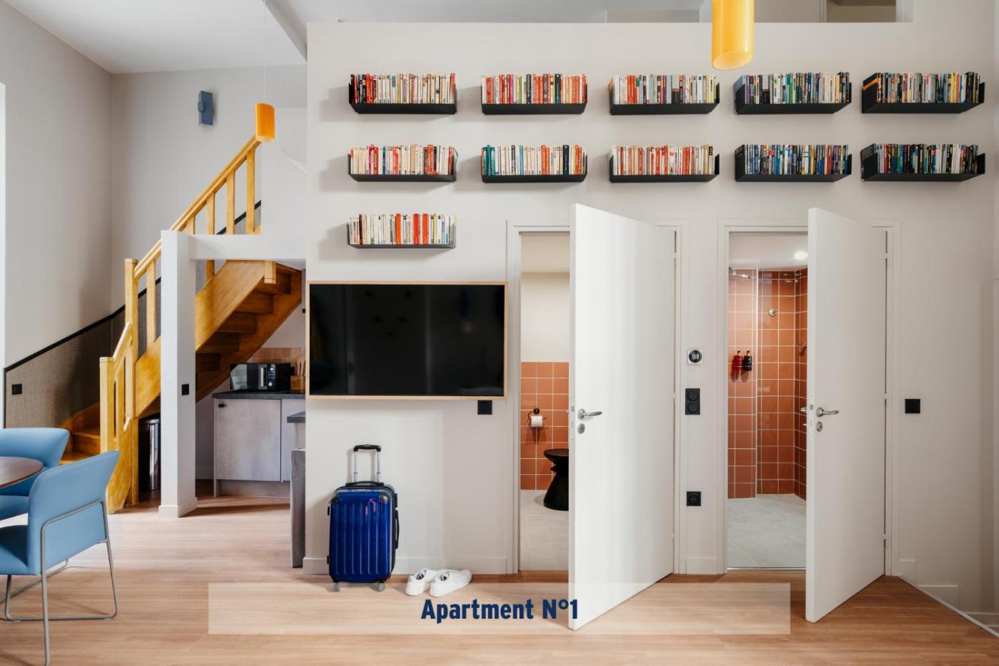 Appartement N° 103 : Studio. Ce studio comprend une salle de bains privative avec douche et sèche-cheveux. Des articles de toilette sont fournis gratuitement. Vous pourrez préparer vos repas dans la cuisine équipée de plaques de cuisson, d’un réfrigérateur, d’un lave-vaisselle et d’ustensiles de cuisine. Ce studio avec vue sur une cour intérieure dispose de la climatisation, d’une télévision à écran plat avec des services de streaming, d’un lave-linge, d’une entrée privée et de murs insonorisés. Ce logement comporte 1 lit. ;