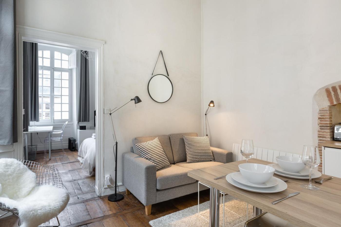 Appartement 1 Chambre. This apartment features 1 living room, 1 separate bedroom and 1 bathroom with a hairdryer. The apartment has parquet floors, a seating area, a sofa and heating. The unit has 1 bed.