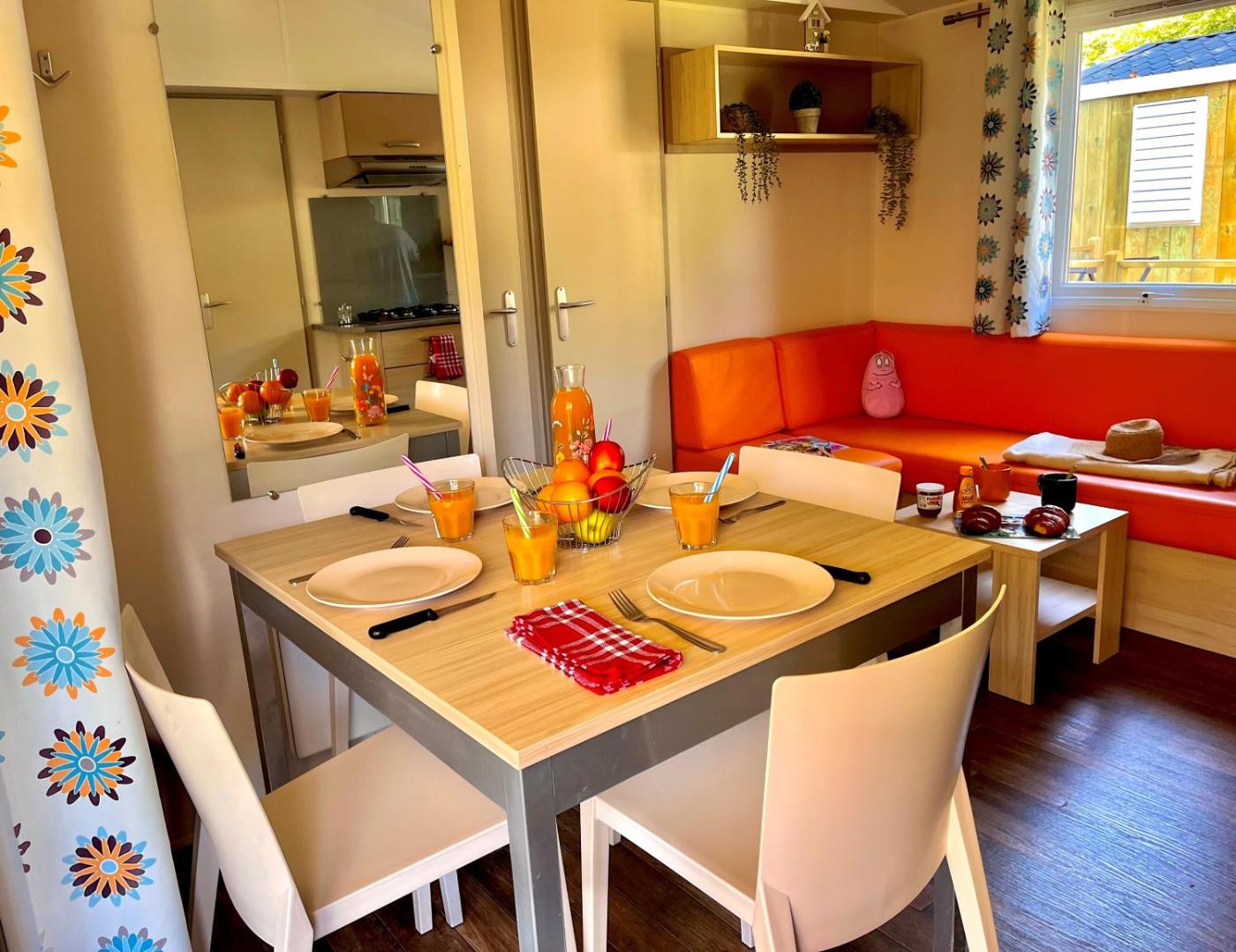Mobile Home. The pool with a view is a top feature of this mobile home. This mobile home includes 1 living room, 3 separate bedrooms and 1 bathroom with a shower. Meals can be prepared in the kitchen, which has a stovetop, a refrigerator, kitchenware and a microwave. The mobile home offers a washing machine, a tea and coffee maker, a seating area as well as a terrace with garden views. The unit has 6 beds. ;