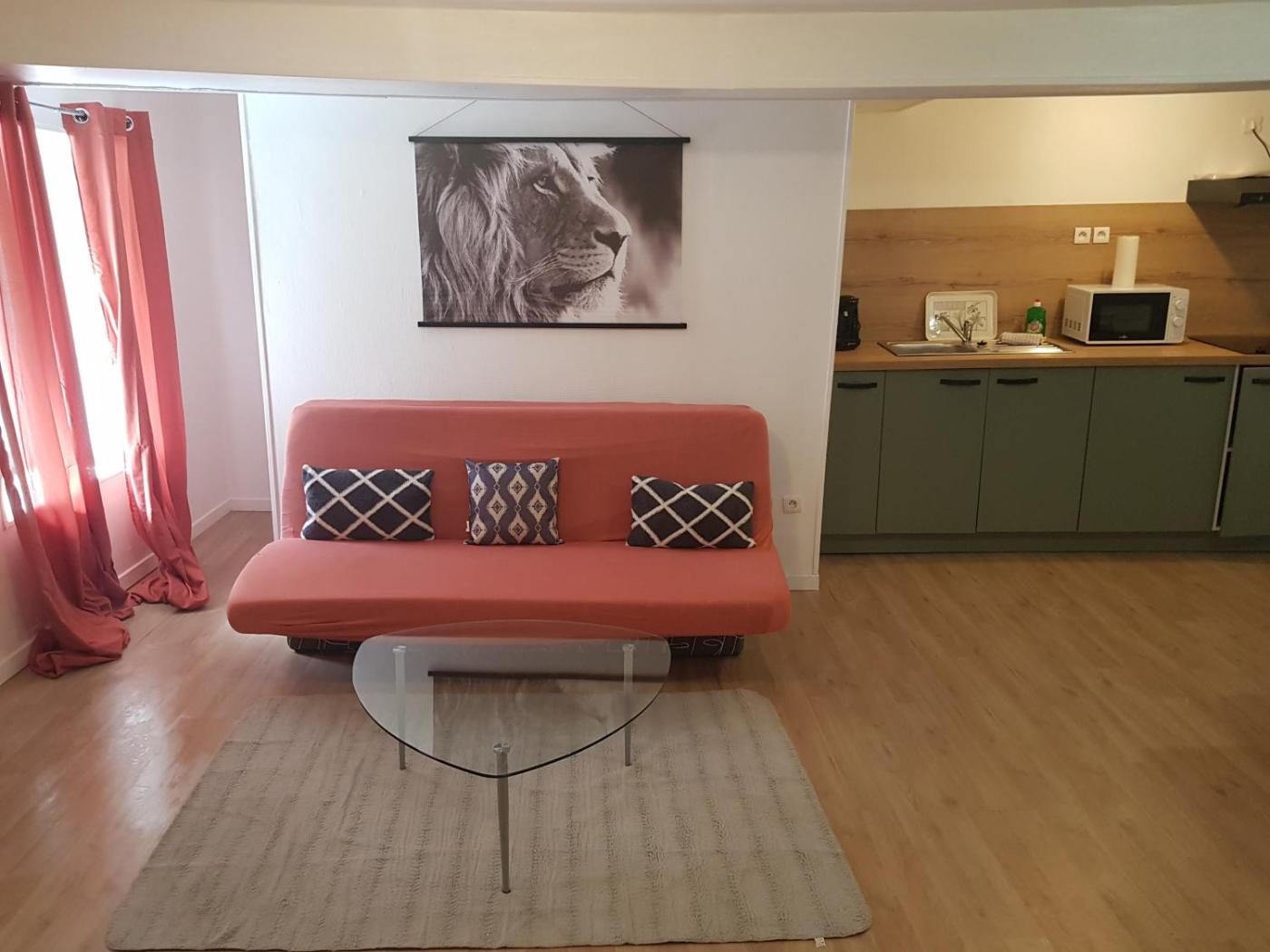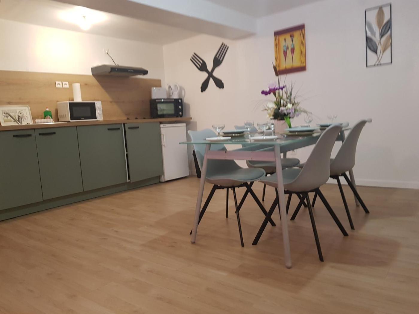 Appartement 2 Chambres. The well-fitted kitchen features a stovetop, a refrigerator, kitchenware and an oven. The apartment offers a coffee machine, a dining area, a wardrobe, a sofa and a flat-screen TV. The unit offers 3 beds.