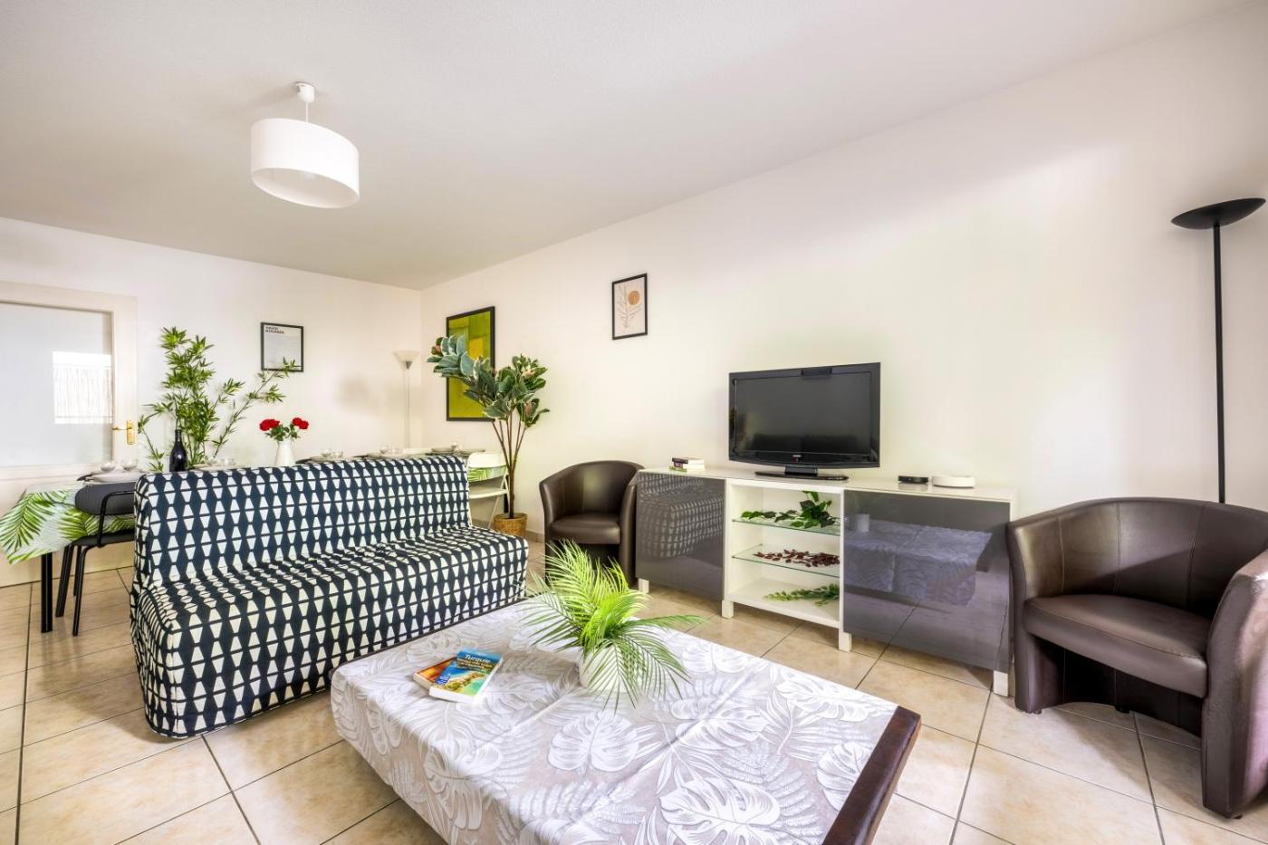 Appartement 3 Chambres. This spacious apartment comes with 1 living room, 3 separate bedrooms and 2 bathrooms with a bath and a shower. Guests can make meals in the kitchen that features a stovetop, a refrigerator, a dishwasher and kitchenware. The apartment features a washing machine, a private entrance, soundproof walls as well as a terrace with garden views. The unit has 8 beds.